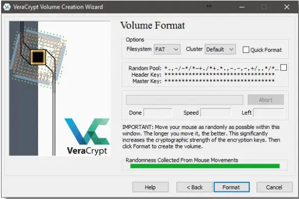 VeraCrypt will use your random mouse movements to generate random data. Make sure the “Randomness” bar has turned green before moving on. VeraCrypt makes a guess or two on your Filesystem choice. I tend to prefer NTFS as being slightly faster in many cases, and supporting more robust security. FAT, on the other hand, works just about everywhere.