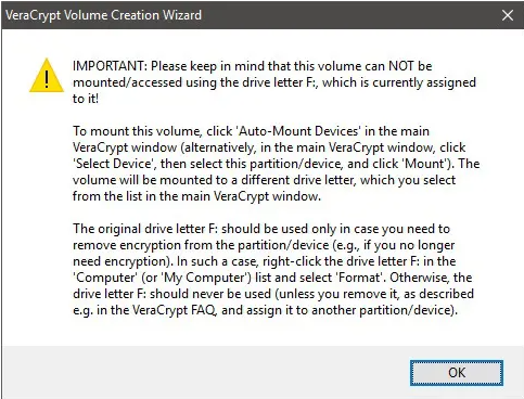 12) VeraCrypt will take a long time to encrypt a volume of any significant size. It doesn’t matter how much data is on the volume; all sectors, whether they’re used or not, are encrypted. When complete, VeraCrypt provides some additional instructions on how to mount your encrypted drive (see next section).