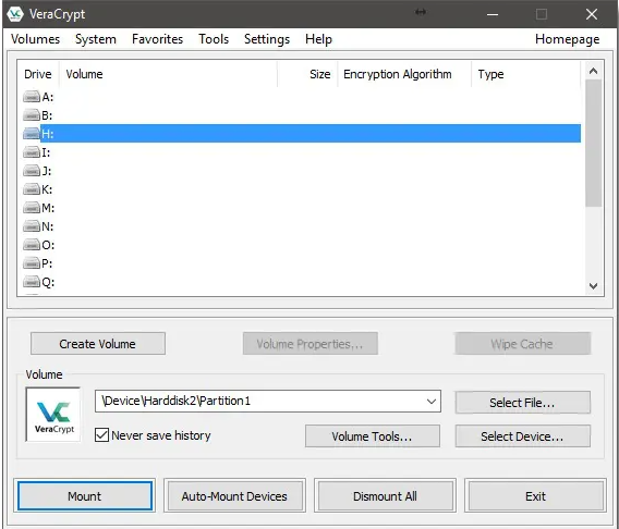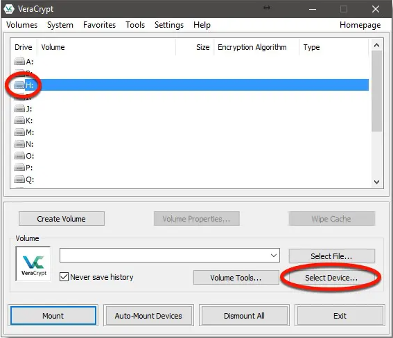 2) Open VeraCrypt and click the drive letter you want your encrypted volume to appear as, and then click Select Device….