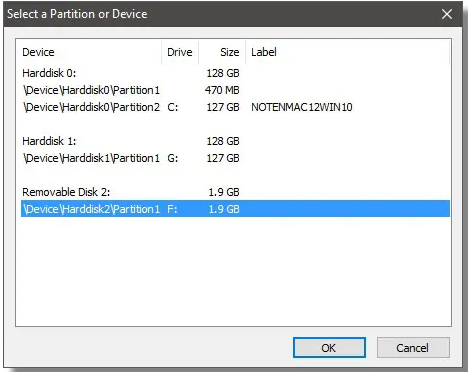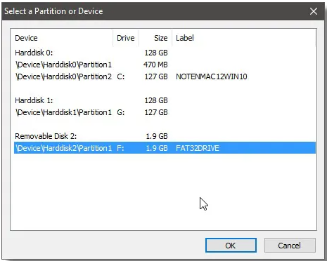 4) Click the Select Device… button on the following dialog (not shown). You can see that each hard disk on my machine is listed, including the external one. You'll click on your external drive, and click OK.