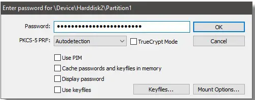 Do not forget your password. A VeraCrypt volume cannot be accessed without the password. There are no back doors or recovery methods. If you lose your password to a VeraCrypt volume, you have lost the contents of that volume.