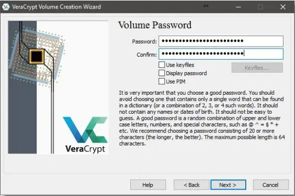 9) Password selection : the single most important aspect of this entire operation. VeraCrypt will allow you to see the password as you type it in, if you so choose (check the Display password box).