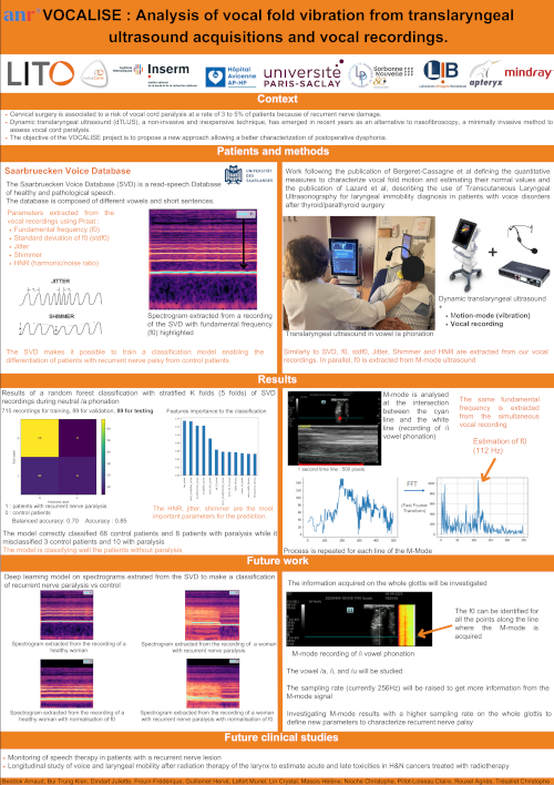 L’objectif de VOCALISE est de proposer une nouvelle approche permettant une meilleure caractérisation des dysphonies post-opératoires ou radio-induites. Il s’agit d’associer aux acquisitions optimisées ETLd des acquisitions de la vibration de chaque corde vocale en phonation simultanément à des enregistrements vocaux.